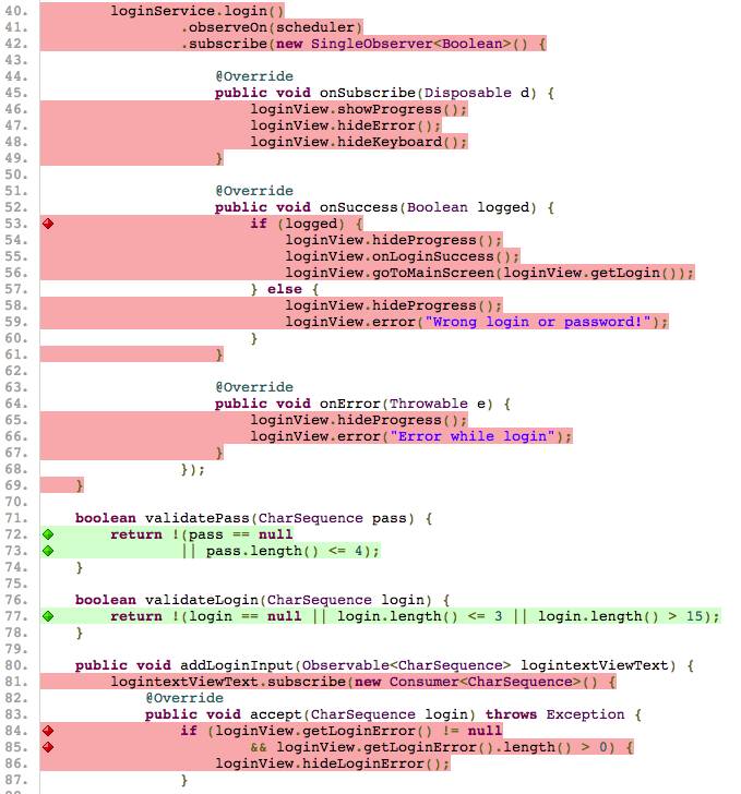 让我们看一下 LoginPresenter 类,并确保其中确实有很多没有被执行到的指令和分支。