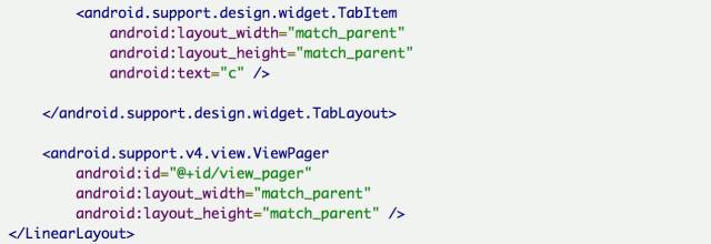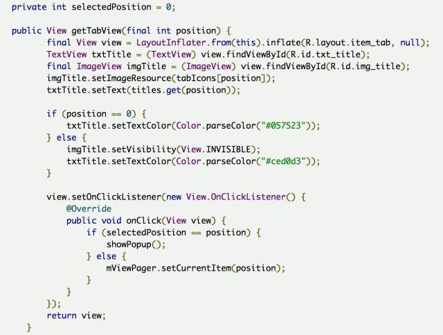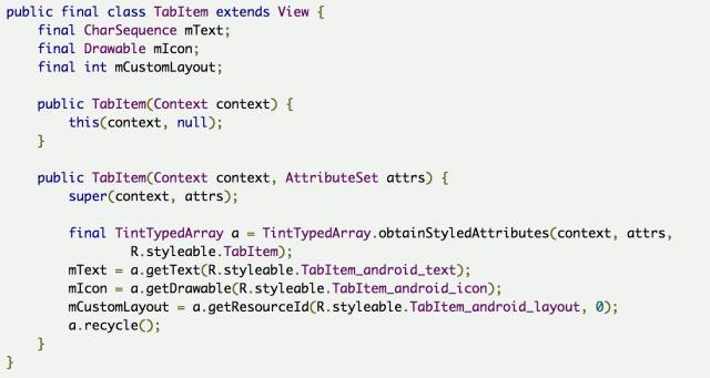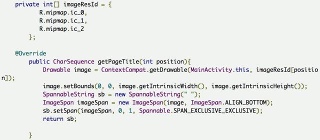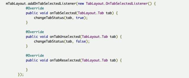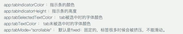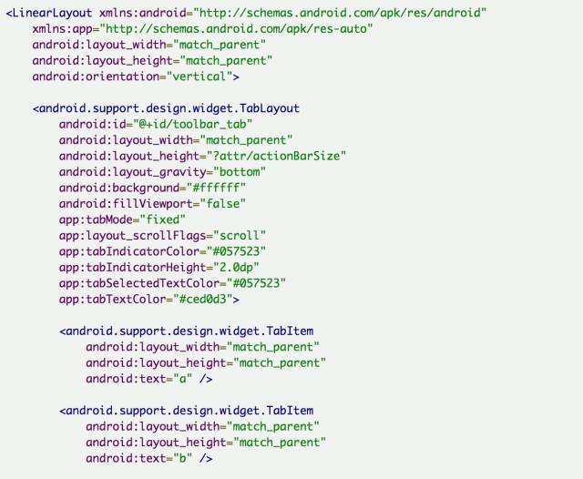 上代码,看效果 先来个简单通俗的代码: 上面代码的运行效果如下: 为了使用TabLayout,我们要让Activity继承自AppCompatActivity,但有时候你项目里的BaseActivity却是继承自FragmentActivity的,这就尴尬了。其实没关系的, AppCompatActivity 也是extends FragmentActivity的。可以把BaseActivity extends AppCompatActivity。如果不想这么做也可以,可以指定当前Activity的theme为 android:theme="@style/Theme.AppCompat" 然后build.gradle文件在dependencies里加上 compile 'com.android.support:design:25.0.0' 然后基本上就不会有什么问题了。 下面来解析下TabLayout的一些基本属性: 重要的属性基本就这些,其他简单的属性可以自己去摸索,这里选中和未选中的字体颜色,可以根据自己的设计自行修改,同样指示条的高度颜色也可以随意修改。 但假如我的设计里不需要指示条怎么办,好像没发现隐藏的API,那也很简单。有两个思路: app:tabIndicatorHeight="0dp" 2:把指示条的颜色设为透明: app:tabIndicatorColor="@color/transparent" 效果如下: TabItem 在高版本的design库里已经有了TabItem,TabItem是作为TabLayout的子View而配合使用的,点进去发现其实代码很简单,就是个自定义View。 所以当我们的需求能够明确知道Tab的个数时,可以在xml里直接添加TabItem。但是但是,心细的你不知道有没有发现问题,我在上面的代码中,tab明明设置的小写,但是运行出来确是大写: 事先申明我可没在代码里重新设置文本,就是这么操蛋。好在天无绝人之路,找到了一个属性叫app:tabTextAppearance,这是Tablayout的属性。TabItem代码简单到几乎没有什么属性可供设置,什么字体大小,颜色貌似都设置不了。 所以我们自己写了个样式,然后酱写: app:tabTextAppearance="@style/MyTabLayoutTextAppearance" MyTabLayoutTextAppearance里的代码如下: 这里的android:textAllCaps属性就是控制字体大小写的,TabLayout里默认是true,我们手动改成false即可,我们顺便设置了下字体。 但是但是,问题又来了,我设置的字体大小貌似没什么卵用,无论我怎么调节字体大小就是不变。呵呵,还是要从tabTextAppearance这个属性来着手。 下面我们把代码改成这样: app:tabTextAppearance="@android:style/TextAppearance.Holo.Large" 这下好了,字体的大小写解决了,字体大小也解决了。这样的属性我们找到了3组, 大 小 分别设置字体为大中小,说实话,这玩意真的不太好用,跟其他控件比起来,这个属性设置有点绕。 不要用文本了,改成icon吧,wtf,TabItem根本没有这样的属性啊,TabLayout貌似也没有啊。怎么搞?TabLayout没有明确地提供向Tab中设置图标的途径,但是很多事情总可以另辟蹊径。我们知道,Tab是使用adapter中的getPageTitle()方法做其显示的内容,这个方法返回类型为CharSequence。于是,我们可以在PagerAdapter中重写getPageTitle()方法,创建一个SpannableString,而将图标放置在ImageSpan中,设置在SpannableString中: 好了,运行起来,效果有了。 要不改成icon+文本吧?呵呵。。。又改??? 还好还好,至于图片的select效果应该很easy了,就不演示了,效果如下。 图片在左边?要不放右边吧,不不不,放上面,算了算了,放下面吧。到底放哪??? icon在右边 icon在上边 可以发现通过自定义View的方式我们可以随意摆放文本和icon的位置,无所谓上下左右,处理起来都是一样的。甚至一个tab想放两个icon或者两个文本什么的都不在话下。总体来讲Tablayout的坑还是蛮多的,很多API都没提供,或者提供了但留了很多坑,这很google,一方面给你一个很常用的控件,一方面这个控件又留了很多坑,最后这个控件带给你无限想象和发挥,根据自己的想法,动手去实现吧。 关于自定义Tablayout我们放在后面再说,我们再来看看Tablayout的一些其他“坑”。 开发过程中有同学需要修改abIndicator这个指示条的长度。关于这个问题我只能又呵呵了,因为控件居然没有提供修改tabIndicator长度的API。如果非要强行修改就只能用反射了,但有时候需求就是这么操蛋。直接上代码吧,调用下面这个方法,传入左右间距即可,具体长度可以根据实际情况调试。 setIndicator(this, mTabLayout, 20, 20); 运行效果如下: 又有同学提到TabItem动态添加比较好,那是自然的,很多时候我们的数据可能是从服务器下来的,具体有多少个TabItem 有可能也是不太确定的,这个时候当然是动态添加比较好。关于TabItem 的动态添加也很简单。 或许有些时候是从一个集合里读取数据填充,那就要来个for循环了,这个根据自己的实际情况来定。 到现在我们还没有上TabLayout的用法相关代码,下面我们来一个相对标准的使用简介,通常情况下大家会这么写。 运行起来之后,居然是这个样子的。我的标题呢? 官方推荐我们使用setupWithViewPager()方法,来完成这种Tablayout+Viewpager+Fragment组合的数据绑定,上面的代码实在看不出上面问题,但是我的标题呢?我们点进setupWithViewPager()方法查阅了下源码。 这个方法也不算太长,只是对viewPager的状态做了一些检查校验,设置了一些监听。看这一句: setPagerAdapter方法里又调用populateFromPagerAdapter(); 点进populateFromPagerAdapter() 方法第一句就是removeAllTabs(); 就是这么简单粗暴,直接全部清理掉了,我们且不去探讨源码中的这个逻辑是否有问题,单就setupWithViewPager()这个方法来说,这也算是一个不大不小的坑。所以我们自己在写代码的时候要注意避让。那关于上面我们自己写的代码就要做些调整,我们修改下initFragment方法,主要是代码语句的顺序上做些调整,如下: 代码逻辑上,我们在setupWithViewPa
