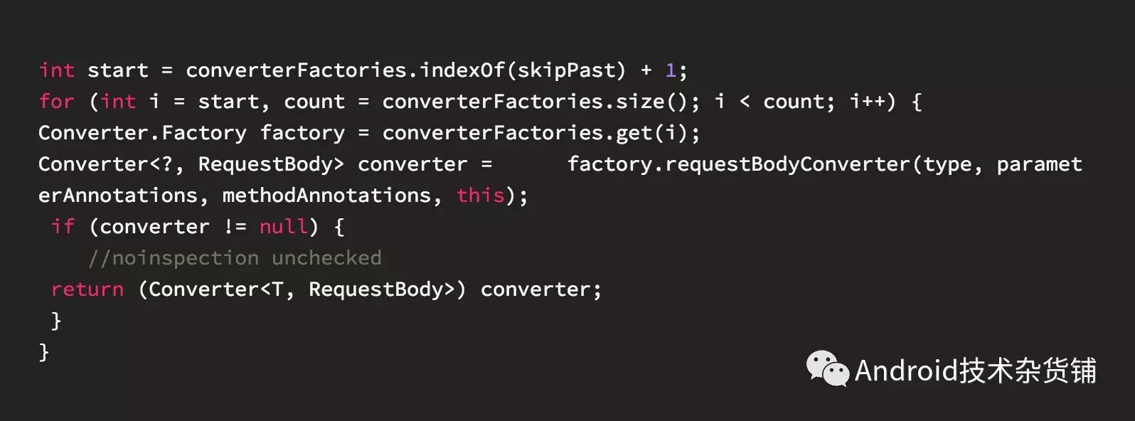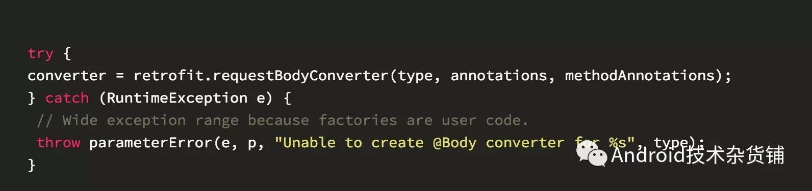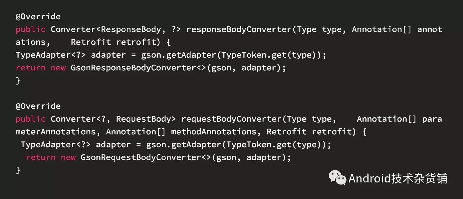 错误原因:不能创建对应实体的转换器,看到converter这个词是不是有点熟悉?当然熟悉了,前面一片讲Retrofit+RxJava的封装的时候就在Manager里面配置过统一的Coverter,没看过的请移步到 Retrofit + RxJava + OkHttp 让网络请求变的简单-封装篇 , 这个Converter跟我们这儿的错误有什么关系,这就要回到我上面说的那个问题了,@Body 标签是以什么形式上传的参数?答案是上传的@Body 参数实体的Json字符串,所以内部需要一个GsonCoverter来将实体转换成json字符串,也就是封装的时候在Manager里统一配置的addConverterFactory(GsonConverterFactory.create()),那这里为什么会报错?原因是:由于项目的需要,我们对请求参数和请求结果做了一些加密和解密过程,因此 Retrofit默认提供的GsonConverterFactory不能满足我们的需求,于是自己重新写了一个GsonConverterFactory,而看GsonConverterFactory的源码就知道,需要复写两个方法,一个是responseBodyConverter,返回请求结果的转换器,另一个是requestBodyConverter 返回一个请求参数的转换器,项目中我只写了第一个方法,因此其他API的接口都是正确的,用到@Body标签的接口就会报错。连个接口源码如下: