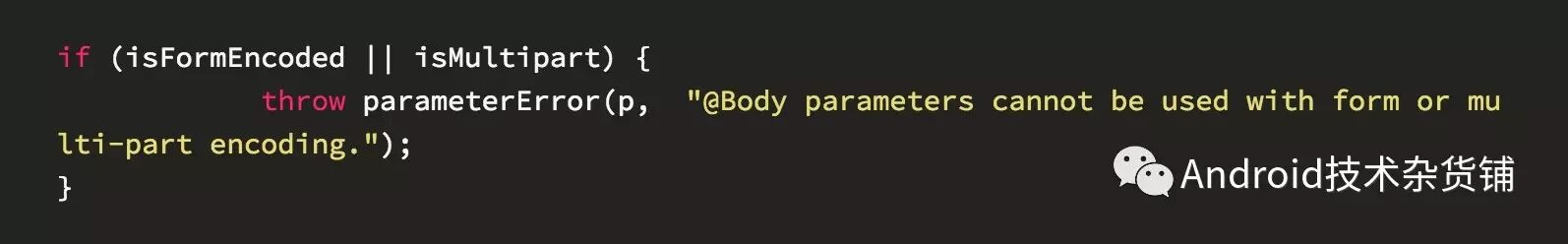 从源码可以看出,在解析道@ FormUrlEncoded 的时候会把isFormEncoded设置为true,在解析到@ Multipart 标签时,把isMultipart设置为 true,所以现在我们就知道了为什么@Body 标签不能同时和@FormUrlEncoded、Multipart标签使用了。