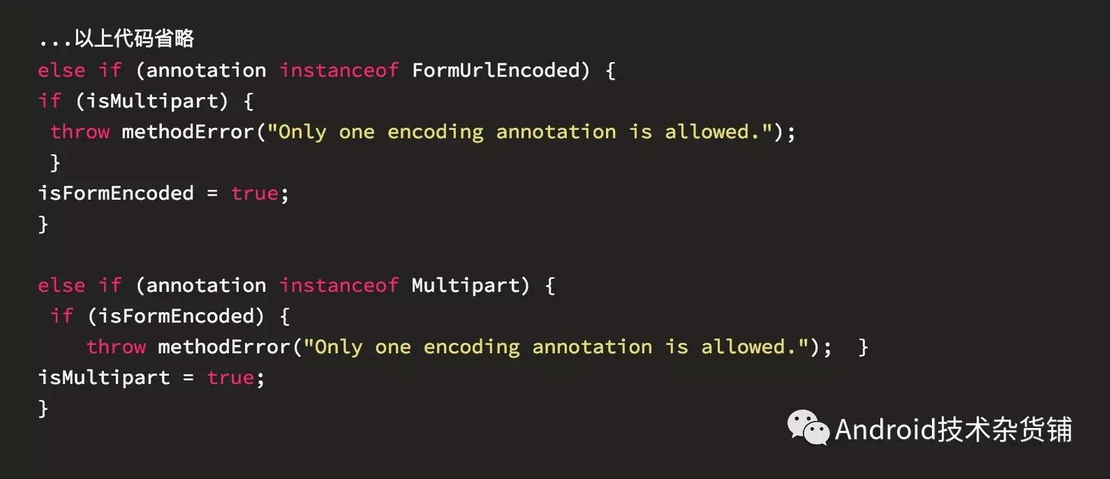 从源码可以看到,抛异常的地方有两个条件,isFormEncoded为true或者isMultipart为ture,满足其中任何一个条件都会抛出该异常,通过变量名字就可以看出是使用了@ FormUrlEncoded 或者@Multipart 标签,我们还是看一下这两个变量是在哪儿被设置为true的: