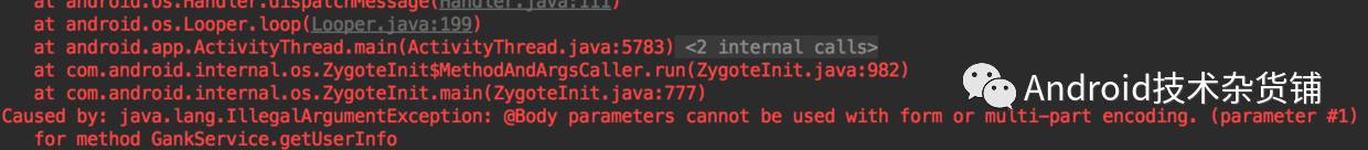 我看到过好几篇介绍Retrofit的文章都是上面这样写的,他们可能根本就没有测试过,像上面示例代码写就会抛上面提到的异常,因此,去掉@FormUrlEncoded 就可以了。