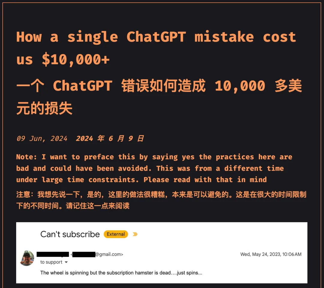 一家名为 Reworkd 的初创公司在尝试商业化过程中,通过使用 ChatGPT 生成的代码进行项目迁移,导致服务因为代码错误无法正常订阅,造成超过 1 万美元的损失和 5 天服务停机。。。